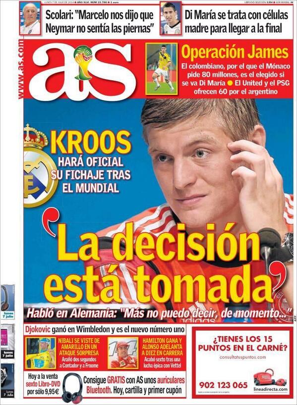 Myös Bild kertoo jo Kroosin siirron olevan varma, joten enää virallista vahvistusta odotellessa. Siirtosumma 25milj euroo. Sopimus julki MM-kisojen jälkeen. Tykkään kyllä tästä jotenkin, vaikka harmittavasti di Marian siirto taitaa olla nyt askeleen todennäköisemp.  :peukku_alas: