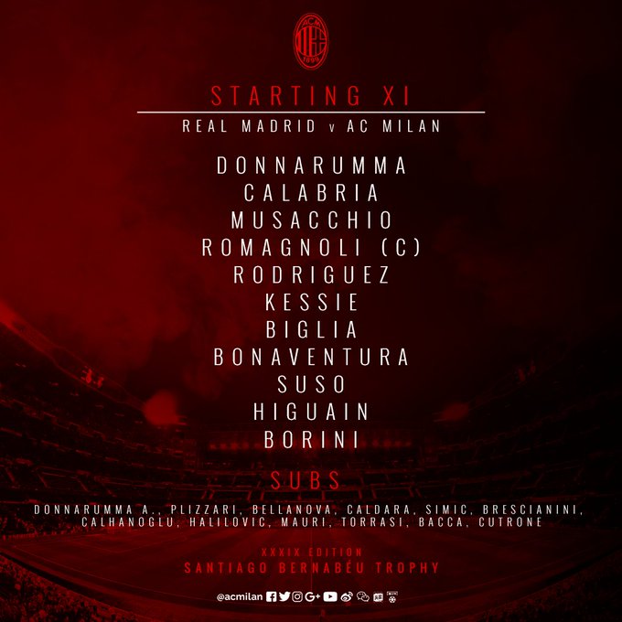 AC Milan | Donnarumma; Calabria, Musacchio, Romagnoli, Rodríguez; Kessie, Biglia, Bonaventura; Suso, Higuaín & Borini